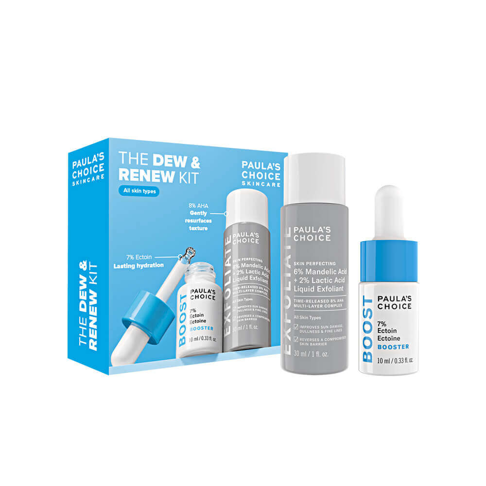 The Dew & Renew Kit reunește un exfoliant cu acid mandelic și un booster cu ectoină care acționează împreună pentru o piele mai netedă, cu o culoare mai uniformă. Exfoliantul cu acid mandelic netezește suprafața pielii și ajută la estomparea imperfecțiunilor, în timp ce boosterul cu ectoină sprijină bariera cutanată și contribuie la echilibrarea nivelului de hidratare în straturile pielii.