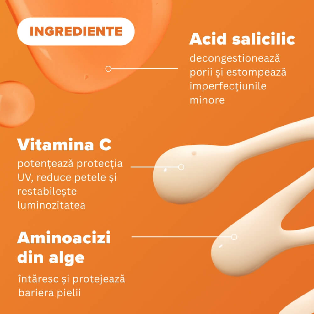 5% Vitamin C Sheer Moisturizer SPF 50 (15 ml) – cremă hidratantă pentru zi cu protecție solară care oferă beneficii suplimentare pielii: hidratare lejeră, uniformizarea culorii pielii, reducerea primelor semne de îmbătrânire (linii fine și riduri) și estomparea petelor. Oferă luminozitate naturală cu ajutorul nuanței translucide de piersică și este potrivită pentru toate tipurile de ten.